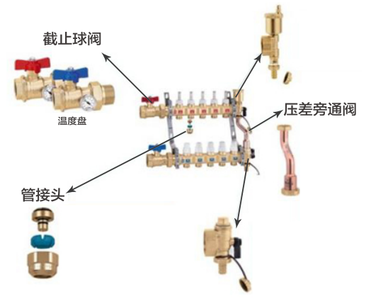 各水環路的分合部件,它具有對各供暖區域分配水流的作用,同時它還是金屬部件與