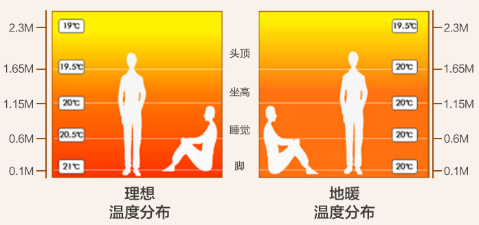 熱從地板通過輻射散熱到熱體活動區,最接近人體的溫度需求