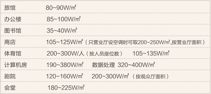 根據國內現有的一些工程冷負荷指標套用(下列指標為按總建筑面積的冷負荷指標):